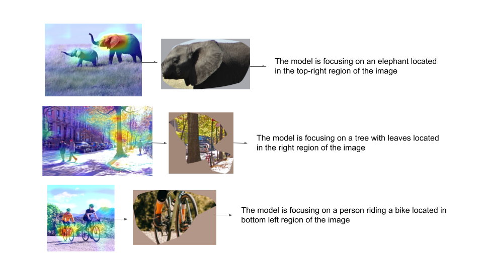 We experimented with the family of GradCAM models as our visual saliency map generators. These models, given a CNN and an input image, produce a heatmap that highlights the crucial regions of the image in relation to the CNN’s predictions. For the image-to-text model, we used the BLIP model. Examples of the final results from the entire pipeline are illustrated at the top.